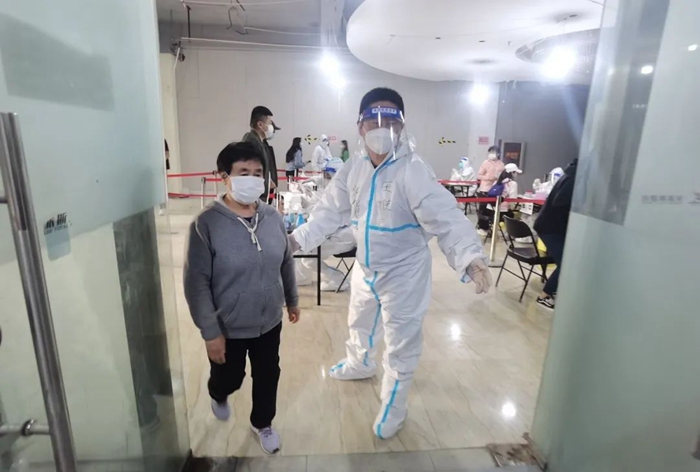 共產黨員張增惠在延靜里社區華商大廈檢測點參加防控志愿服務。