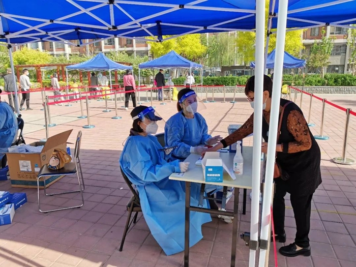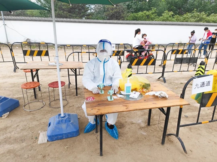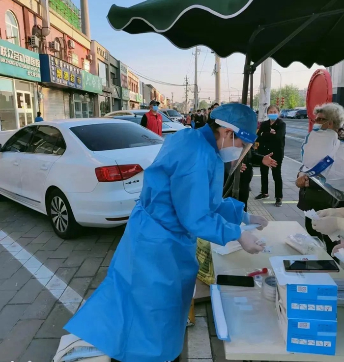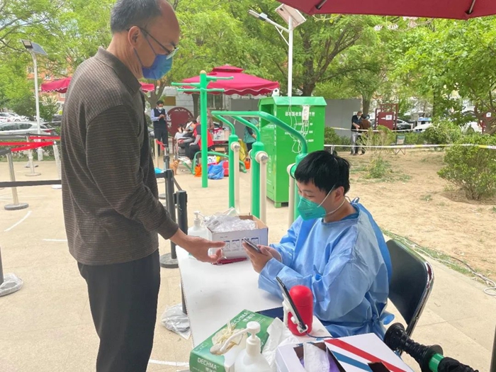 共產黨員冀高娜在朝陽區興隆社區參加核酸檢測志愿服務。