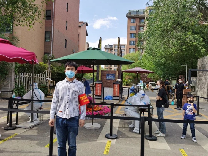 共產黨員高振宇在豐臺區青塔街道匯錦苑社區參加防控志愿服務。