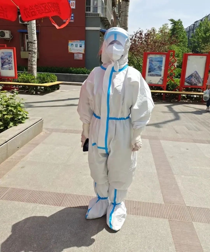 共產黨員單安琪在通州區翠景北里社區參加入戶調查和消殺工作。