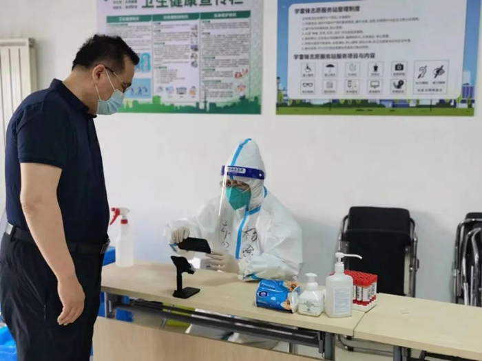 共產黨員李旭偉參加大興區舊宮鎮清欣園社區核酸檢測志愿服務。
