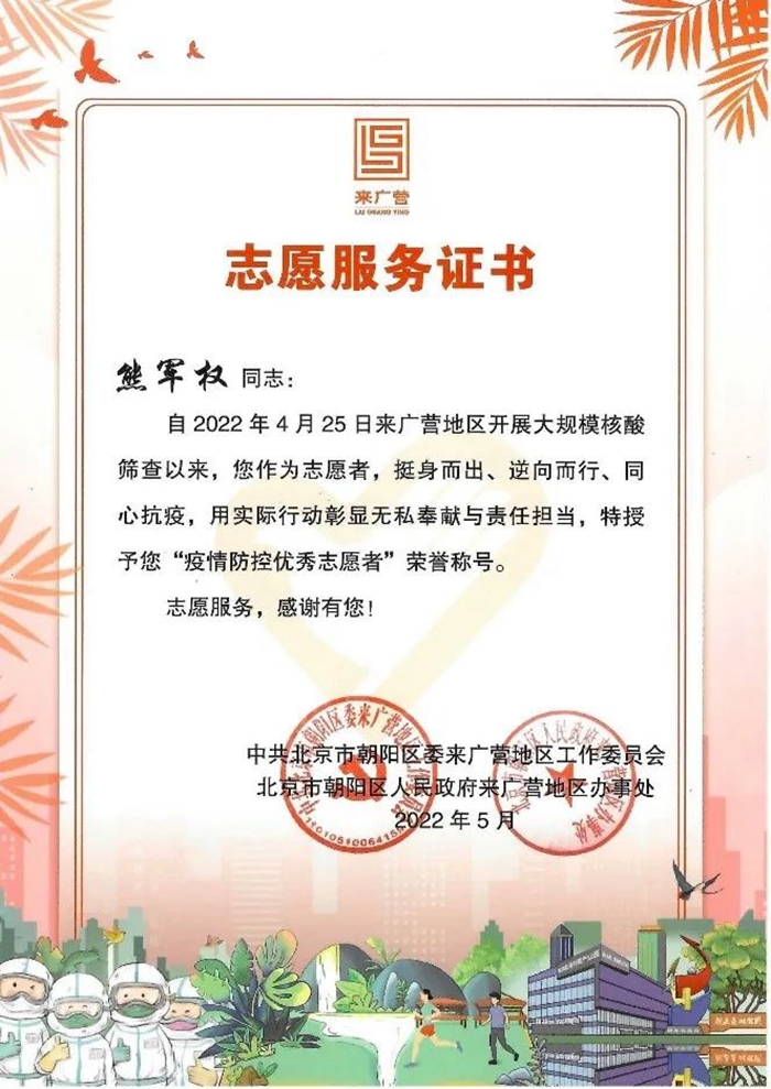 我真心地感謝北京化工集團、華騰東光公司領導給予了我這樣一次難得的、意義深遠的志愿服務機會,公司黨總支、工會還給我送來了慰問和溫暖。如果再有這樣的機會,我依然會積極去服務,盡自己的努力為身邊的人做一些力所能及的事。我志愿,我快樂,請組織放心,請領導放心,為了北京的平安,為了社區(qū)的平安,作為國企職工,我一定堅持到底,戰(zhàn)斗到底,直到北京全面清零,共創(chuàng)我們的美好家園。