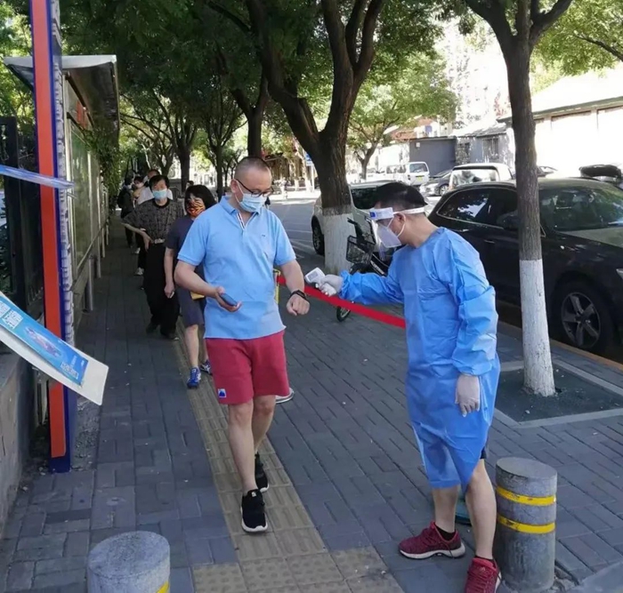 眼看天氣越來越熱,北京出現(xiàn)連續(xù)高溫,為更好地保護負責檢測的醫(yī)護和社工人員,社區(qū)決定下午一點停止檢測,可是這個舉動開始并不被居民們理解,往往到了一點之后還是有人陸陸續(xù)續(xù)前來測核酸。每每這個時候,我總會站到隊尾向大家解釋,告訴他們坐在隔離艙內檢測人員的不容易,請大家換位思考給予諒解。雖然有時會面對許多質疑的聲音,但我依舊會保持一份熱情、一份理解、一份關愛,因為我堅信,這身防護服帶給我的是榮耀、是真真切切為人民服務的標識。現(xiàn)在,居民們漸漸理解了工作人員的不易,我也感受到了居民們的通情達理和關愛。