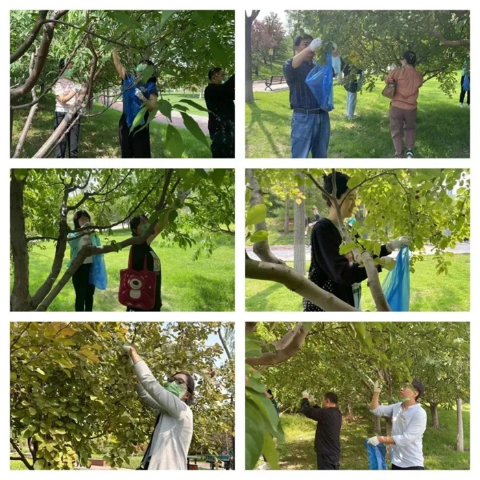 此次活動內容為樹木疏果,顧名思義,疏果就是疏除多余的果實,最大限度減少樹體的無效養分消耗,集中營養。通過疏果,可調節樹體健壯。工作內容雖然簡單,但大家仍然認真聆聽公園工作人員對此次活動內容的講解,絲毫沒有怠慢的想法。活動中大家熱情高漲,自動分組,有人負責海棠樹有人負責桃樹,一切井然有序。