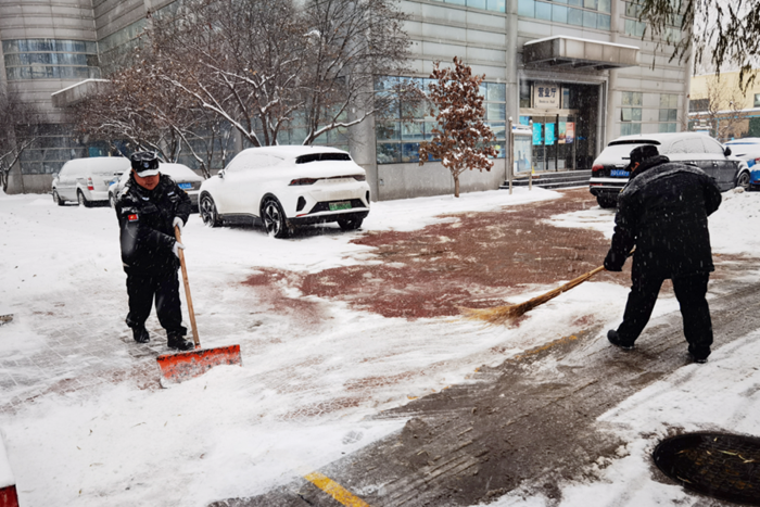 大雪壓城,華騰拓展公司迅速響應(yīng),每天派出50余名職工進(jìn)行掃雪鏟冰行動(dòng)。為了確保在寫字樓中辦公的客戶出行和業(yè)務(wù)不受影響,華騰拓展職工冒雪開展掃雪鏟冰工作,并對(duì)主要路段使用融雪劑進(jìn)行融雪作業(yè),防止結(jié)冰打滑產(chǎn)生安全事故。